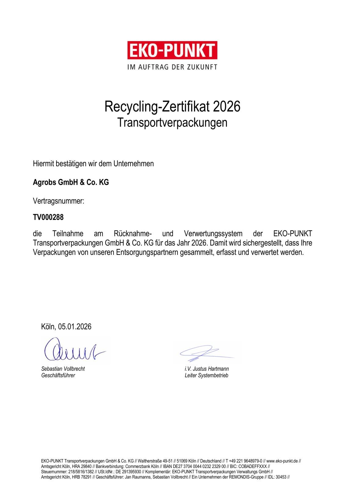 Die Entsorgung der von uns gelieferten Transportverpackungen wird von unserem dualen Systempartner EKO-PUNKT organisiert und ist für Sie kostenlos.Für nähere Informationen zur Abwicklung wenden Sie sich bitte an deren Hotline.