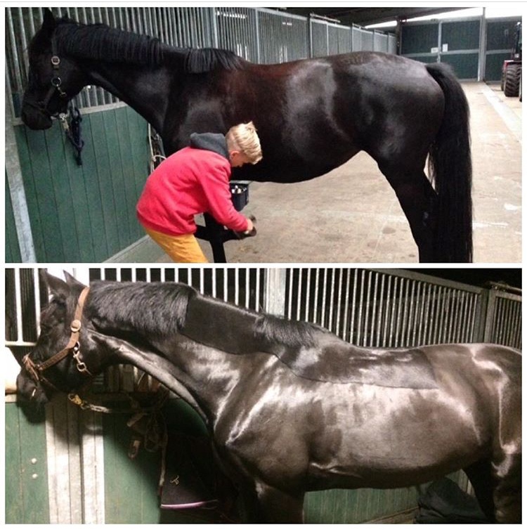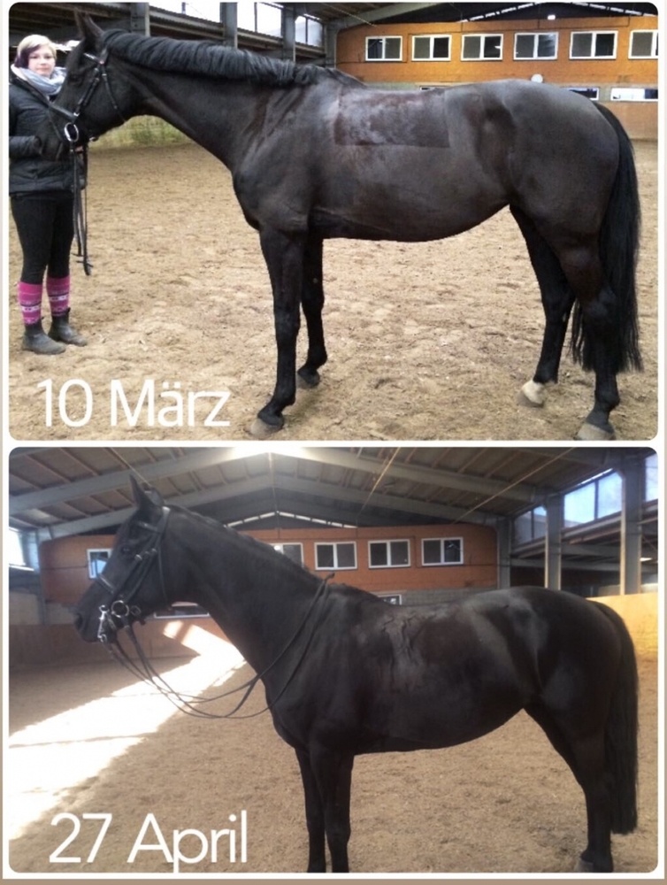 Auf der Suche nach einer getreidefreien Alternative bin ich dann auf das AlpenGrün Mash von Agrobs gestoßen. Meine Stute frisst es bis heute problemlos und das ganz ohne Melasse. Sie hat endlich an Masse zugenommen und frisst es an warmen Trainingstagen auch mit etwas mehr Wasser. Auf Anraten von Agrobs habe ich dann Anfang 2019 das Amino Pur als Kur zugefüttert und bin restlos begeistert. Nach zwei Wochen Eingewöhnungszeit fraß sie das Futtermittel sogar morgens mit ihrer kleinen Portion Krippenfutter. Und das Resultat nach 5 Wochen spricht eindeutig für sich (siehe Bild).