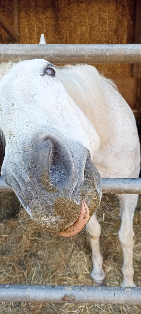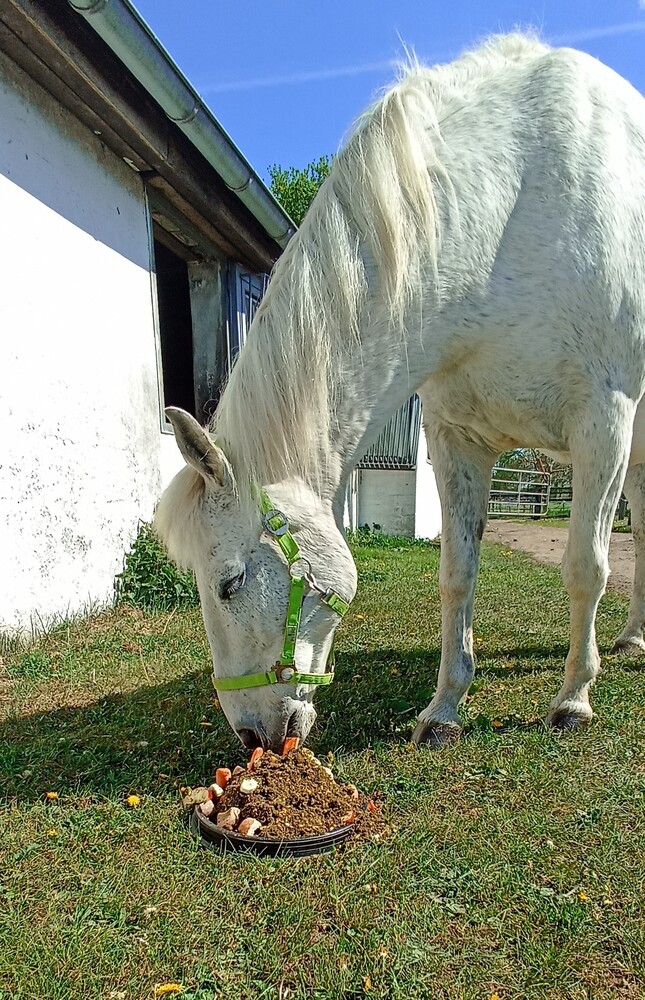 Mein inzwischen 27- jähriger Andalusier-Dt.Reitpony-Mix Oriente (kurz Orie) war immer leichtfuttrig, obwohl ihm seit mehreren Jahren die Vorderzähne wegen EORTH fehlen. Er gehört zu mir seit seiner Geburt.