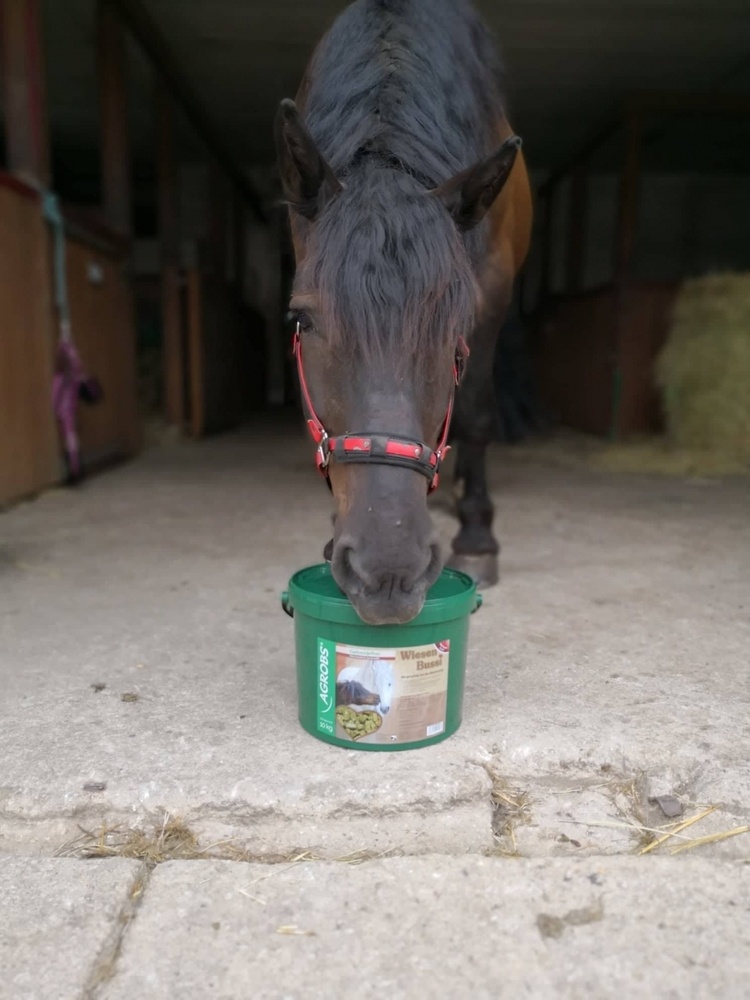 Im Jahr 2017 hatte Merlin krankheitsbedingt stark abgebaut und musste wieder auftrainiert werden. Auch hier habe ich wieder Rat bei der Firma AGROBS gesucht und bekommen. Über Luzerne+ sind wir schließlich auf die Luzerne Cobs gekommen, die ich bei Merlin auch bedenkenlos uneingeweicht verfüttern kann. Durch den erhöhten Eiweiß-Gehalt kann ich mein Pferd ohne zusätzliches Getreide beim Muskelaufbau unterstützen und schmecken tut es ihm sowieso. Im Winter weiche ich die Cobs auch gerne mal mit warmem Wasser auf, wovon Merlin ebenfalls sehr begeistert ist.